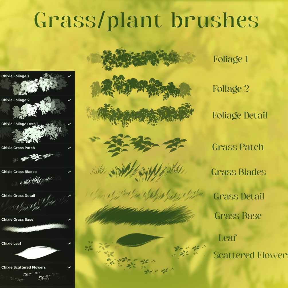 These are my favorites brushes for painting organic backgrounds! Perfect for creating your own lush environments, this brush set helps artists to to block in shapes and colors of grass, plants, and clouds in a quick and convenient way!